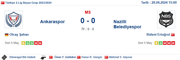 28/04/2024 tarihinde oynanan Ankaraspor-Nazilli Belediyespor futbol müsabakası ile ilgili maç sonucunu etkilemeye yönelik tespitler nedeniyle Ankaraspor Kulüp sahibi Ahmet OKATAN, Ankaraspor Kulüp Başkanı Mehmet Emin KATİPOĞLU, Nazilli Belediyespor Başkanı Şahin KAYA ve 2 antrenörünün de bulunduğu tespit edilen (5) şahı gözaltına alındı.